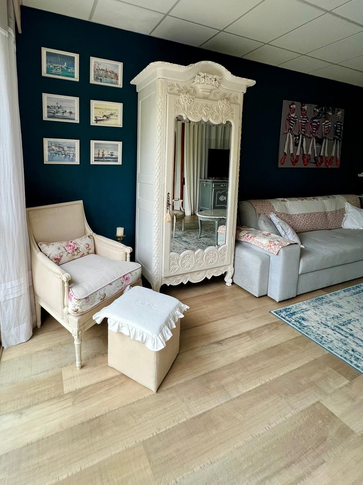 Chambre MAISON DU MONDE lit boucle King size 180cm, fauteuil boucle, chevets. Salon MAISON DU MONDE composé d’un canapé, 2 fauteuils et une table. La Suite Marylin vous accueille pour un moment bien être et détente. Au centre ville de Riom, à 15 min de Clermont, vous y découvrirez: JACUZZI king size avec eau neuve à chaque séjour, SAUNA, table de massage, grande douche, salon avec écran géant, hi-fi, bar avec réfrigérateur, micro-onde, cafetière