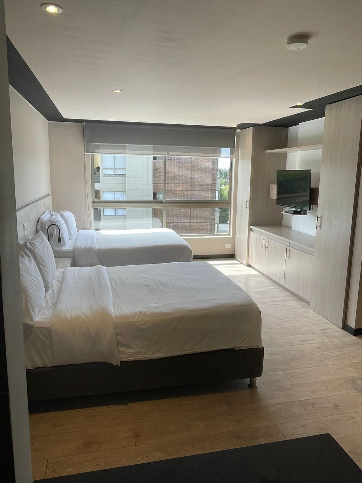 Con un amplio espacio de 23m2, cuenta con una acogedora alcoba, una zona de entretenimento perfecta para relajarte, un balcón para disfrutar de una espléndida vista, cocina equipada, un cómodo escritorio para trabajar; amplio vestier para organizar tus pertenencias, lencería de calidad y un baño completo para tu comodidad. Cuenta con cajilla de seguridad, plancha y mesa para planchado.