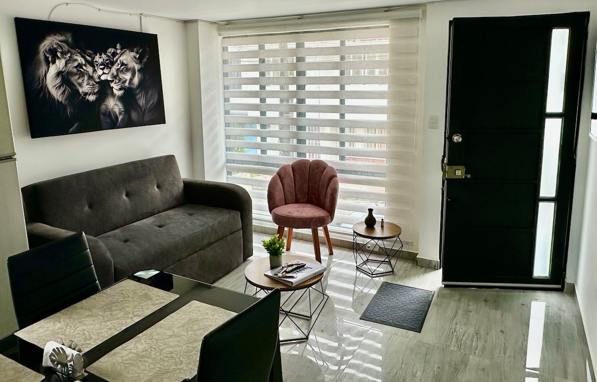 Relájate en un espacio tranquilo y moderno, ubicado en el barrio la Maria a dos cuadras del hospital y de la avenida Fundadores, cerca del estadio, el coliseo, la pista de patinaje y Super gol. En 10 minutos a pie llegas al centro de la ciudad. Cocina y dormitorios equipados, con facilidades para descanso sin ruido, trabajo remoto o estudio. Iluminado, limpio, ventilado y rodeado de áreas verdes, el lugar ofrece un ambiente seguro. Con atención en inglés para huéspedes internacionales.