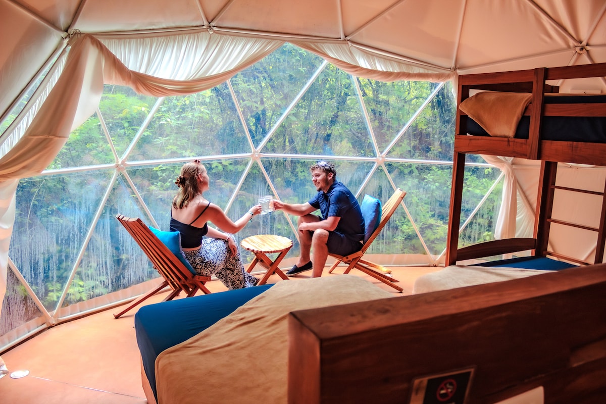 Discover tranquility in our double Geodesic Domes, nestled in the heart of the Mayan jungle. Relax in a serene environment with comfortable queen beds and enjoy panoramic views of lush nature. Connect deeply with the natural beauty around you, finding peace and renewal in this cozy, harmonious space. This is the perfect place to disconnect from daily stress and rediscover your essence in a welcoming and tranquil setting. This hotel is cashless... Enjoy a 100% cash-free experience!
