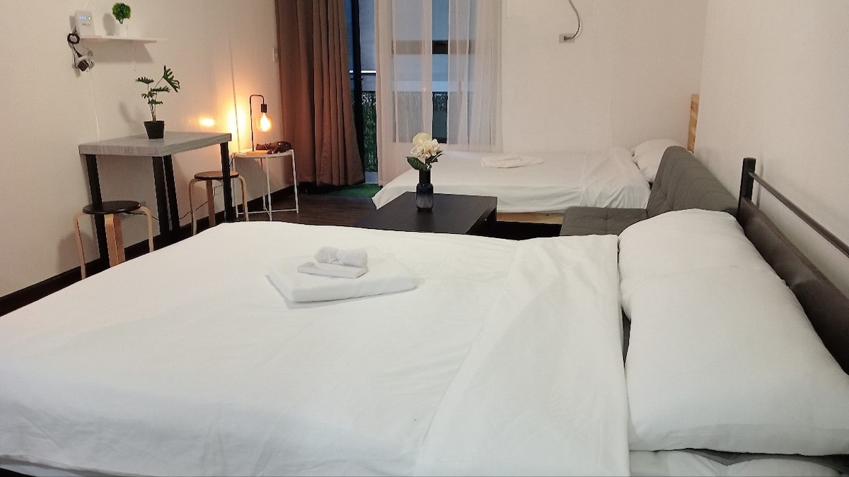 Enjoy a cozy stay in this modern loft-style condo with stunning city views. Relax by the window lounge, watch the skyline at night, or unwind in the stylish open-layout living area. The unit features a comfy sofa bed, bar counter, kitchenette with essentials, flat-screen TV, and air-conditioning. Perfect for solo travelers, couples, or business trips. Located near malls, dining spots, and transport hubs for your convenience.