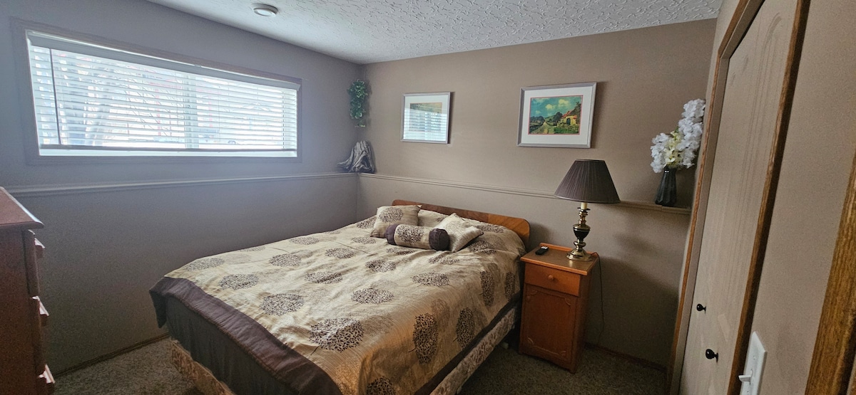 Feel at home in this spacious and serene space. Just 3-5 minutes walk away from fast foods, restaurants, shopping, parks and the Stettler hospital. Watch movies on the 70” TV or just enjoy the scenery of an orchard through the big windows. Ideal for long term stays as well as short stays. Washer and dryer plus a full size fridge. Sleep on two queen Serta beds. Experience the luxury with less money.