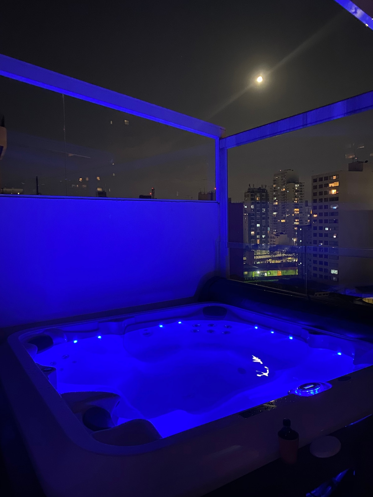 Cobertura deslumbrante com a melhor vista da cidade de São Paulo. Equipado com um terraço privativo com Sauna de vidro com vista panorâmica, jacuzzi super aquecida com hidromassagem e iluminação para cromoterapia e um jardim com lindas plantas para um tempo de relaxamento inesquecível. Não há nada igual disponível para uso em São Paulo. O ambiente de cozinha e estar todo de vidro, teto de madeira e equipado com projeto de alta potência para sua sessão de cinema privativo com pipoqueira.
