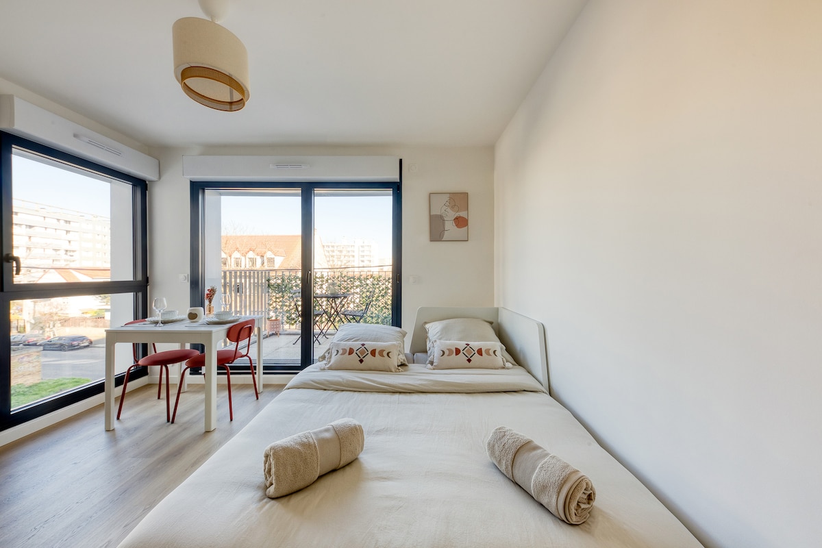 Konfor, zarafet ve rahatlık sunmak için tasarlanmış yeni ve özenle dekore edilmiş bir daire olan modern huzur cennetinize hoş geldiniz. Ayrıca çalışma alanı vardır. İster turistik bir konaklama, ister iş seyahati ister Bourget Sergi Merkezi'nde bir etkinlik için Paris'te olun, bu ev mükemmel bir seçimdir. Stratejik yer: Metro hattına 2 dakika yürüme mesafesinde Paris'in merkezine sadece 15 dakikada ulaşabilirsiniz. Konumu uygun!