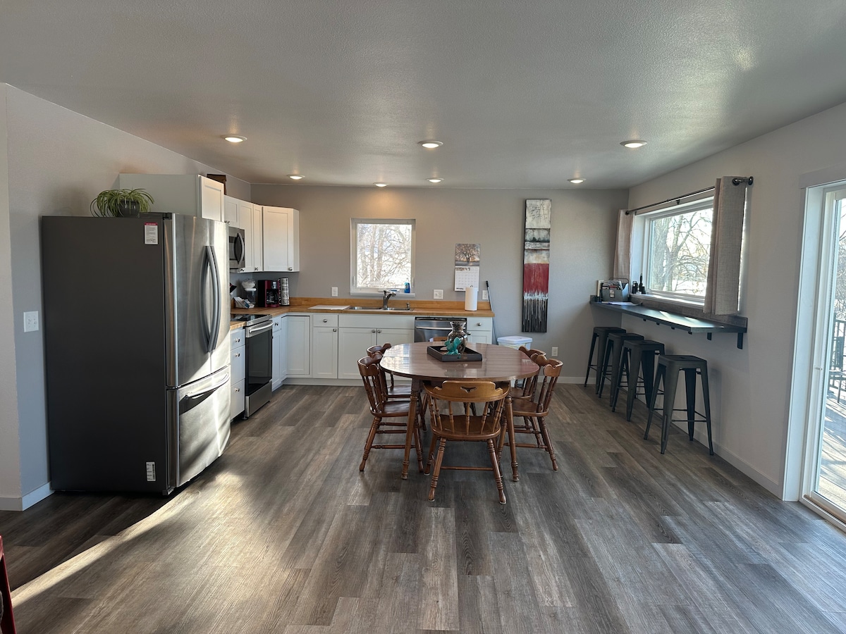 Harvey, ND'nin 14 mil kuzeyinde, ANTELOPE GÖLÜ'nde yer almaktadır - Dekore edilmiş ve tatil için hazır! - 3 yatak odası, 2 banyo. - Yeni inşa edilmiş, sakin, özel ve samimi. - Her yaş için oyuncak ve oyunlarla aile ve evcil hayvan dostu - Ferah, temiz, iyi stoklanmış mutfak. - Muhteşem manzaralı devasa pencereler. - Tüm yatak odalarında Roku TV'ler - Hızlı kablosuz internet bağlantısı. - Ateş çukuru, hamak ve 1,5 dönümlük bahçe - Yürüyüş/ATV parkuru ile arka bahçe göle erişim. - Ev tatiline hazır gizli bir mücevher