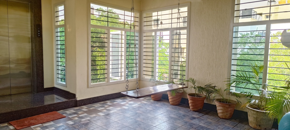 Stili, topraksı, huzurlu bir atmosfer ve rakipsiz panoramalarla harmanlayan 1 BHK (EARTHY Homestay) evimizde sizi ağırlamayı çok isteriz. - Balkon Oasis: Orman manzarası + 200 m'de sinematik gün batımları - Prime Locale: NIFT'e 2 dakika ve 27th Main'in kafelerine, butiklerine ve sokak yemeklerine 3 dakika - Huzurlu iç mekanlar: Queen boy yatak, ortam aydınlatması ve yemyeşil canlı bitkiler. - Çalışma ve oyun: Yüksek hızlı kablosuz internet bağlantısı, büyük TV ve temiz hava. Stil, dinginlik ve muhteşem gün batımlarını tek bir konforlu dinlenme yerinde deneyimleyin! - 5. kat (asansör yok).