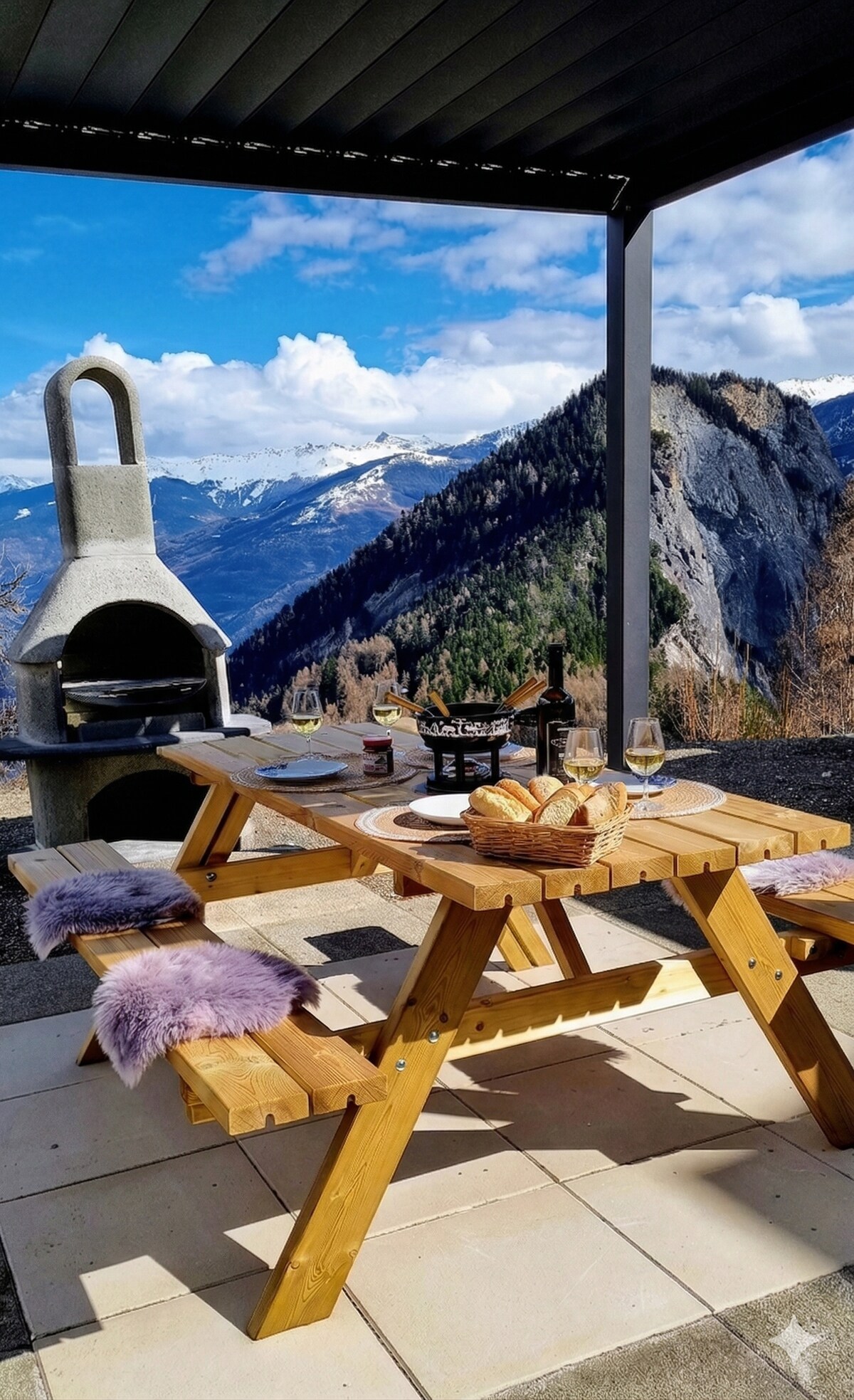 100 m2 teraslı, Alpler'in kesintisiz manzarasına sahip ve özel jakuzili çatı katı stüdyo. İç mekân, katlanır Murphy yatağı (180 cm), büyük ekran TV, tam banyo ve rahat bir ofisi olan açık bir oturma ve yemek odasından oluşmaktadır. Mutfakta ihtiyacınız olan her şey vardır. Dışarıda teras ve manzara sizi bekliyor. Açık hava yemek masası, hamak ve ateş çanağı sizi dinlenmeye davet ediyor. Gemmi & Torrant teleferiklerine ve termal banyolara yakın erişim.