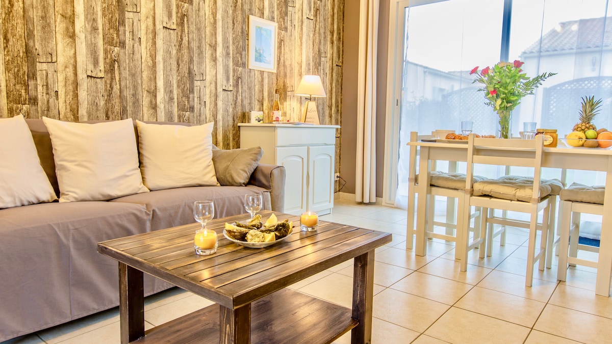 Gîte "La grange" neuf de 35 m² douillet, tout équipé, sur un joli coin de verdure ou vous pouvez vous reposer au calme, aucun vis à vis et à 5 min de Jonzac. Vous y trouverez tous les commerces, idéal curistes (cure à 7 min) Casino, parc aquatique des Antilles , le palais des congrès et base de loisirs. Plages à moins de 45 min. "Le gîte est pour 2 adultes, et le canapé utilisable exclusivement pour 2 enfants SVP . ."Tarif spécial curistes : 750 à 850 €/3 semaines selon période. (pas l'été)