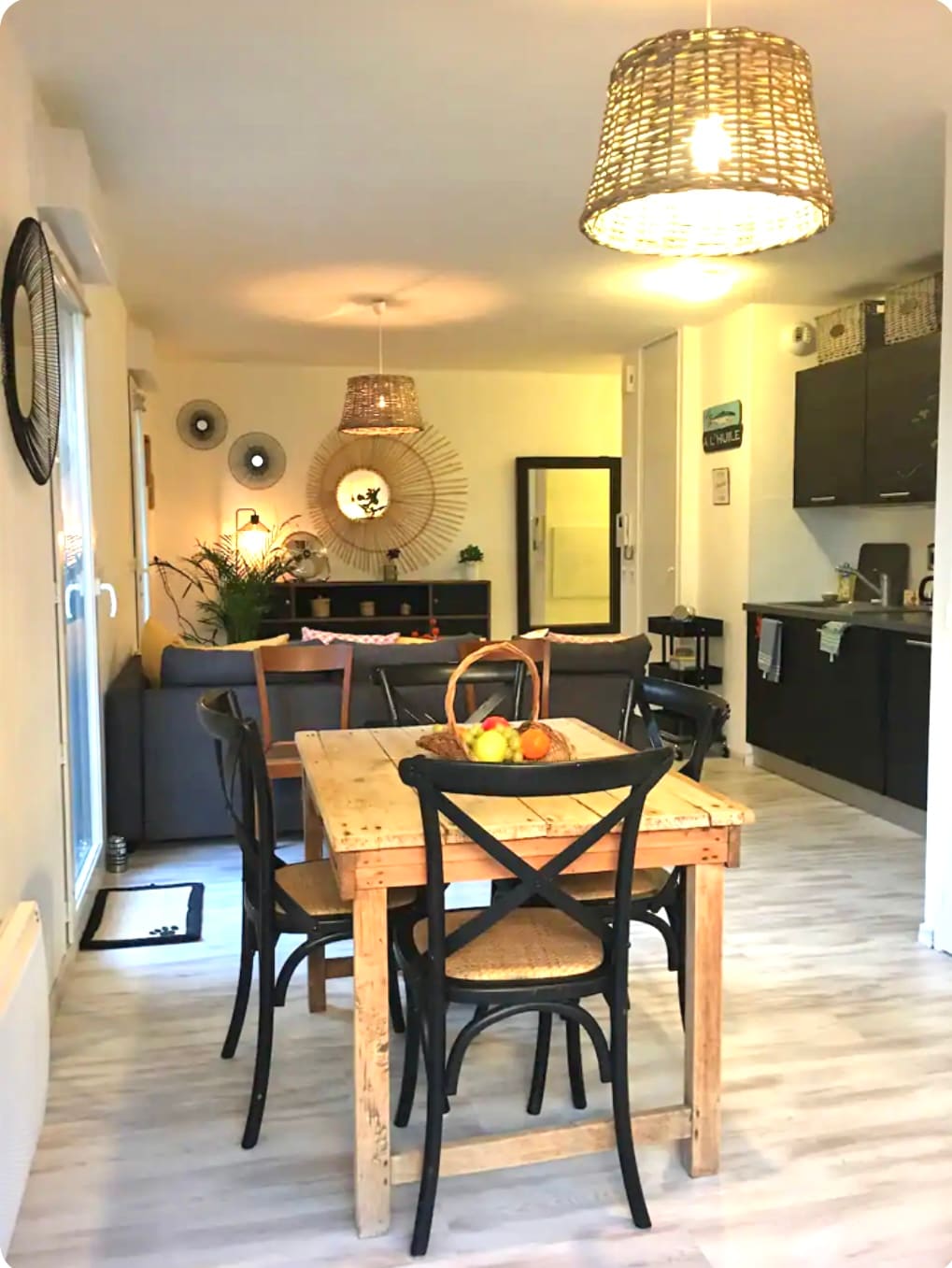 Appartement cosy, chaleureux de 46 m2 avec terrasse Sud aménagée, arborée en RDC (32m2) dans résidence récente et calme. Bien chauffé l’hiver. Parking gratuit A 5 mn à pied de la gare proche de ts commerces, 15 mn à pied de la ville historique et des plages Linge de lit fourni sur demande : 10 € par lit pour le séjour Serviettes de toilette fournies gratuitement Un 2è WC indépendant de la salle de bain Wifi gratuite Nbrx restaurants proches cuisinent en formule à emporter. Télé travail possible