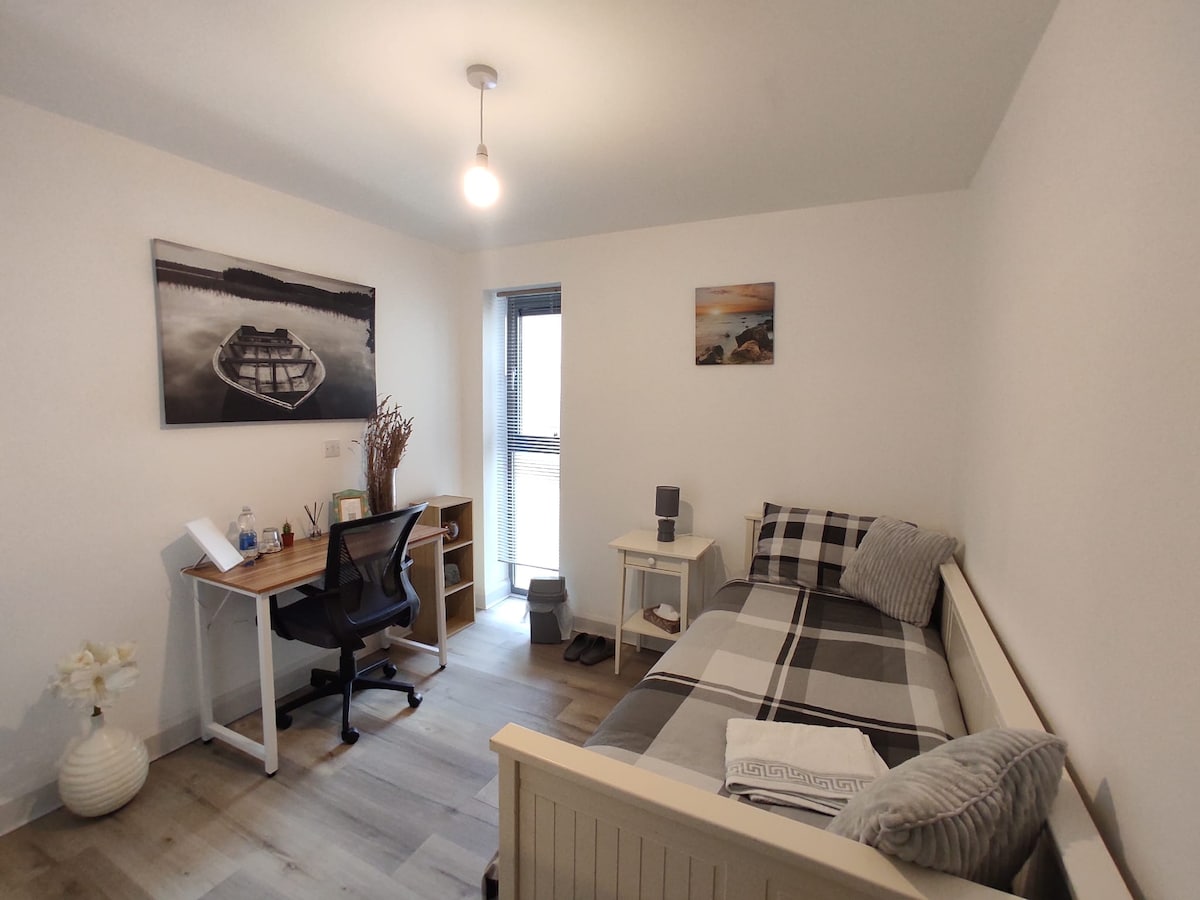 This is a 1 bedroom apartment, with optional Superking bed or 2 twin beds. There are great tech features, such as a bluetooth sound system desk and colourful mood strip lighting in the living room. There is a walk in double shower, with a huge rainfall shower and side shower jets!! The bedroom has hanging space, shelves and cupboards. This is a newly refurbished basement apartment and has a private patio with plants to enjoy. Plus! Everything is available within walking distance