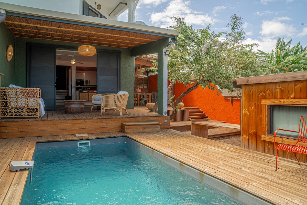 Reunion Adası'nda kiralık yer LA SALINE-LES-BAINS Teraslı konak + 130 m2 4 yetişkin ve 2 çocuk için tuzlu su havuzlu, lagüne kısa bir yürüyüş mesafesinde, yeni yenilenmiş yarı müstakil büyüleyici ev. Evin öne çıkan özelliği, lagüne ve La Saline-les-Bains şehir merkezindeki tüm mağazalara (bakkal, bar restoran, fırın, eczane, doktor) yakınlığı ve karşı akım ve hidro masaj sistemli yüzme havuzudur.