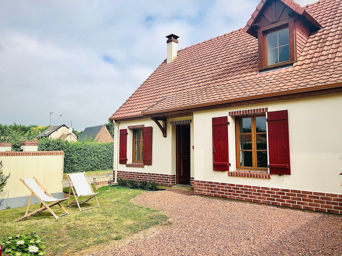 Charming single storey house with wood burning fireplace south facing west private and enclosed garden and terrace. This cute place, nestled in an outbuilding of the owners' house, is located on the edge of a quiet lane with a large park with trees, nature and meadows as neighbours. This place, not far from the Baie de Somme, the sea and the forest, will be ideal for a weekend, a holiday, or a telecommuting break for couples or families.