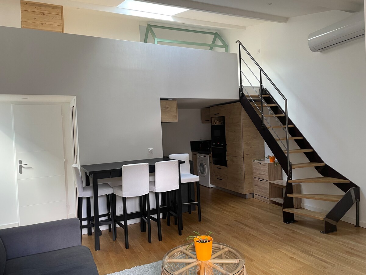 50m²'lik yenilenmiş daire! Hoş, misafirperver, balneoterapi ve açık havuzu ile tam olarak tadını çıkarabilir ve rahatlayabilirsiniz (sadece belirli bir süre için ihtiyaç duyulursa ısıtılır). 1975 yılından kalma pinball makinemiz bazen kaprisli olabiliyor. Bu nedenle düzgün çalışmasını garanti etmiyoruz (rezervasyonunuzun amacı buysa lütfen bize danışın). Keyifli bir konaklama geçirmeniz için elimizden geleni yapacağız!