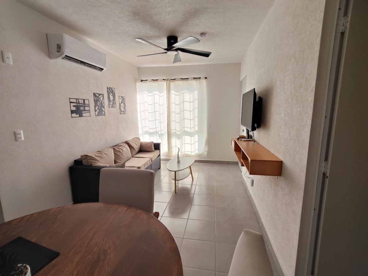 Hermoso departamento ideal para parejas, grupos pequeños o familia. 3 recamaras, 2 baños completos y amplio patio trasero. Aire acondicionado. Alberca y chapoteadero con camastros y sombrillas. Club de playa privado a 7 mins en auto. con 4 amplias albercas y 2 chapoteadero, playa y servicio de comida y bebidas. A 10 min. de centros comerciales, bares y aeropuerto. Playas públicas y restaurantes a la orilla del mar tan solo a unos minutos, Casa Tasgar a 8 minutos.