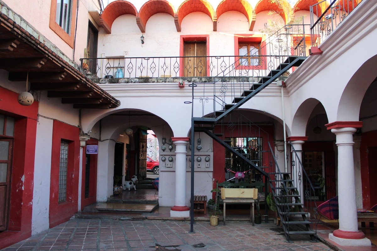 Oaxaca şehrinin tarihi merkezinde yer alan iki kişi için tasarlanmış bu daire, tasarımıyla benzersizdir; duvarlarımız eskilerin yankısını koruyor, yerel cazibenin tadını sonuna kadar çıkarabilmeniz için sizi bohem, sıcak ve doğal bir atmosferde acele etmeden dinlenmeye davet eden evin Porfirian ruhunu ortaya koyuyor. Eski Santo Domingo de Guzmán manastırından iki blok, turistik yürüyüş yolundan sadece bir blok ve başkentin soketinden üç blok ötede bulunuyoruz.