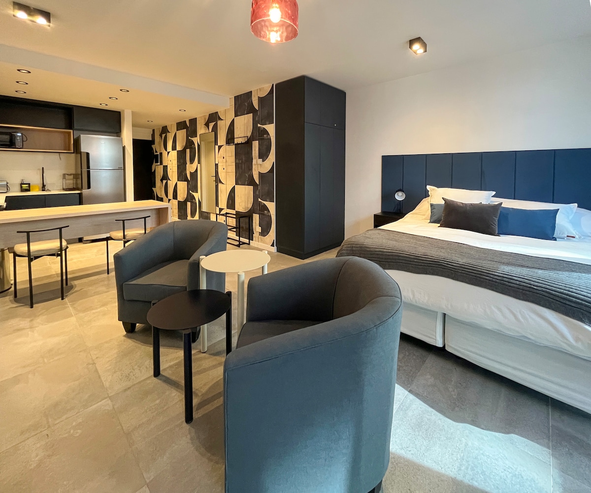Luxury apartment in the famous Faena Hotel Buenos Aires. It is located within the Hotel complex. You have access to all services (swimming pool, gym, spa, restaurants, etc.) Designed by Phillipe Stark, furnished and decorated. It has 50 square meters (475 square feet) and 1 King bed. High speed WI Fi, a/c & central heating, cable TV, internet, Nespresso coffee machine, electric oven & cooktops, microwave, refrigerator, sheets, towels, 24 hour security and concierge service.