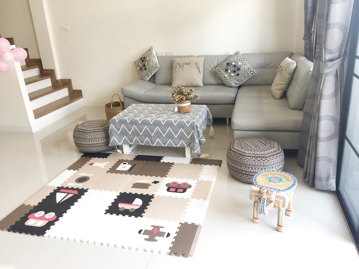 Smart home in Hang Dong’s best area, 3BR 3BA, spacious & secure with private playground & parking for 4. Only 11 mins to airport, near top schools (Panyaden 900m, SBS 3.7km, Montessori 2.8km ,Lanna 5km) & amenities ( Kad Farang Village Community Mall 1.5km, 7-11 1km). Modern, fully equipped with Google Assistant lighting control, Wi-Fi & CCTV.