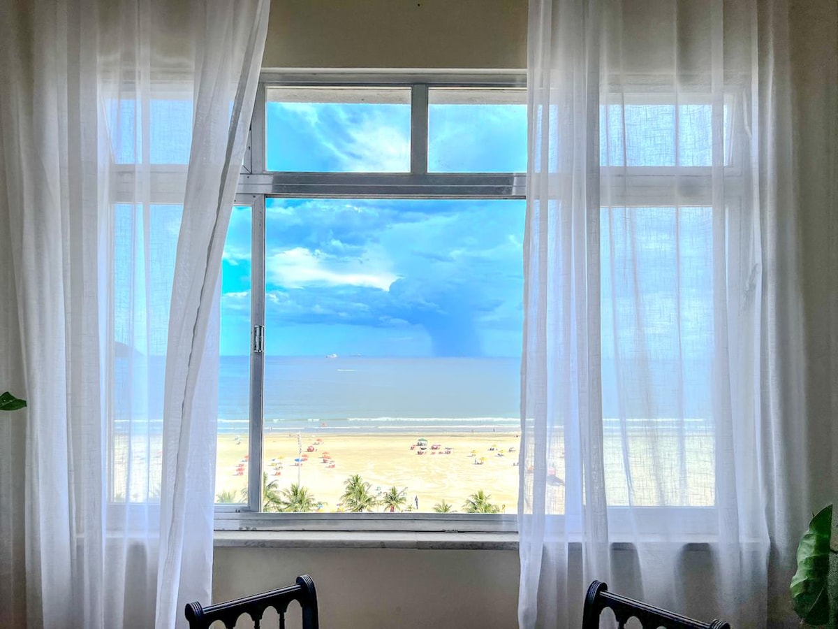 Deniz manzaralı, klimalı ve plajın önünde (kumun üzerinde) daire. Park yeri ve 24 saat kapıcı ile! @airbnb.studios adresindeki dairenin videosu. São Vicente'nin en iyi bölgelerinden birinde, alışveriş merkezine, şehir merkezine ve süpermarkete yakın. Konforlu çift kişilik yatak ve yatak takımı mevcuttur. NETFLİX'Lİ 50inç TV'ye ek olarak. Ocak, buzdolabı, mikrodalga fırın, 4 tabureli masa ve tabak çanak bulunan tam mutfak. Bir hizmet alanı var. Dahili park yeri var.
