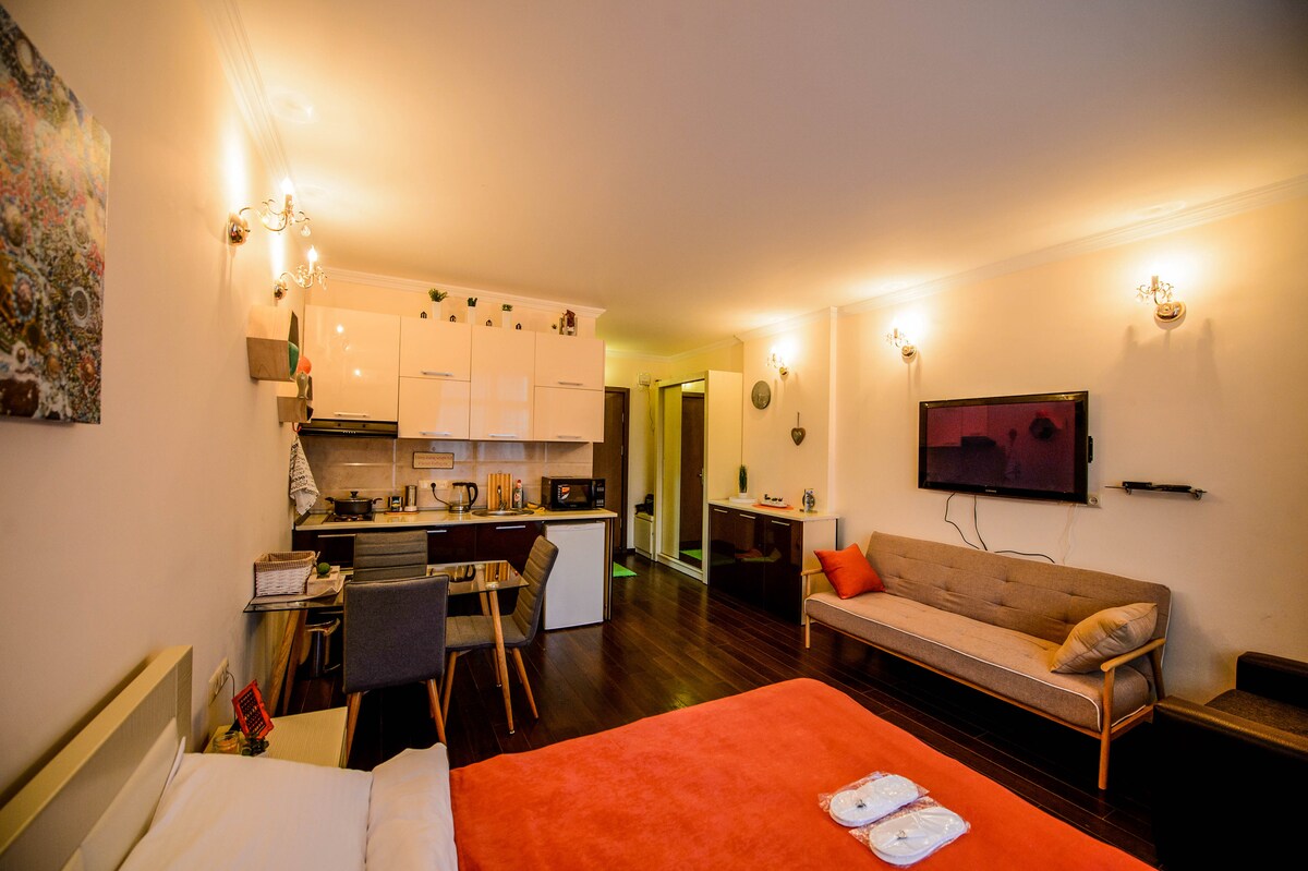 Kendi tarzına sahip benzersiz bir deneyimdir. Daire, New Boulevard'daki SunRise Batum konut kompleksinin 14. katında, plaja 50 metre mesafede yer almaktadır! Stüdyo dairelerde bir mutfak alanı, bir yatak odası alanı, bir balkon ve çamaşır makinesi ve duşlu bir banyo bulunmaktadır. Ekstra bir yatak var - katlanabilir bir kanepe. Balkondan muhteşem bir deniz manzarası var. Akşamları güzel gün batımına hayran kalabilirsiniz.