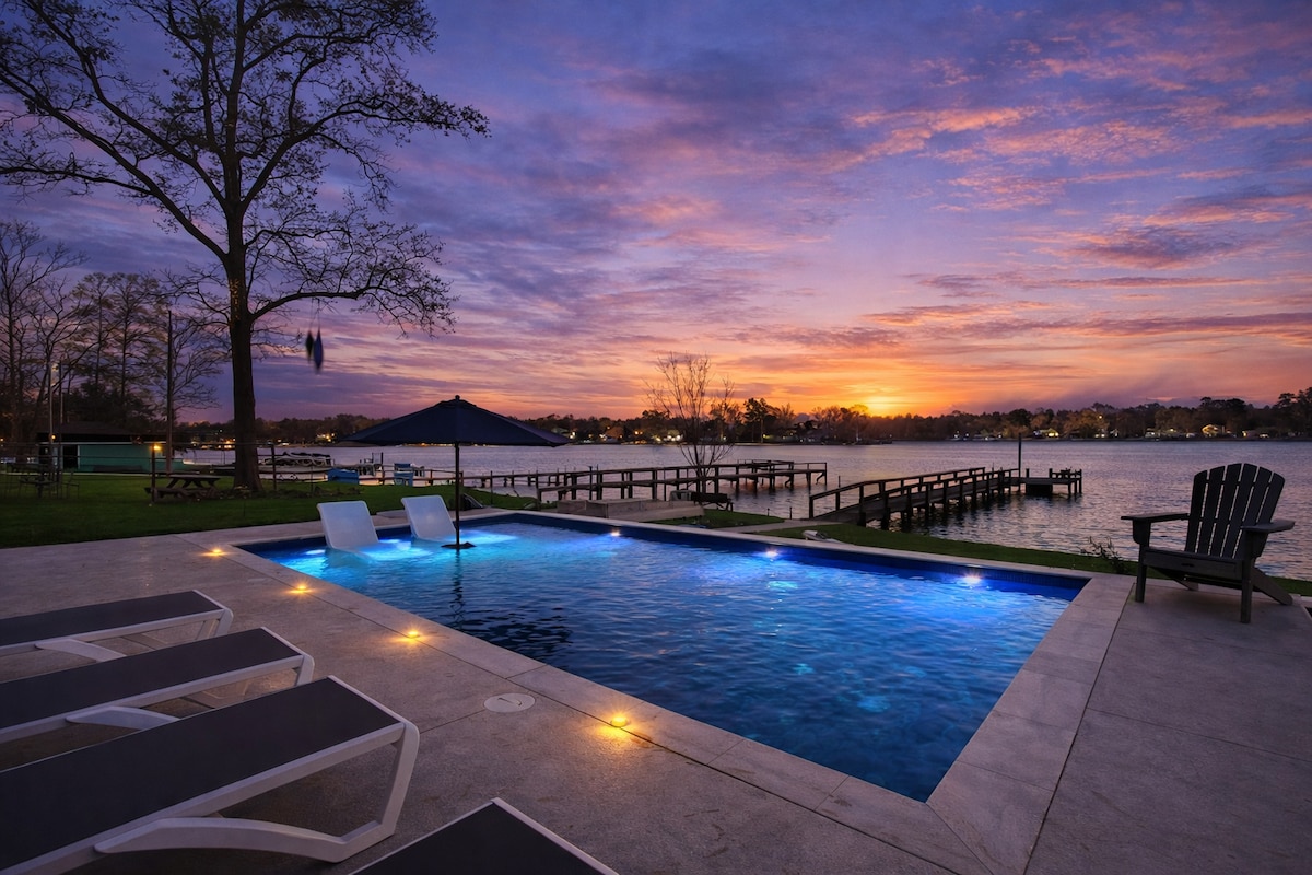 Nehir kenarında kaçamak; havuz, iskele, gün batımı, çitli/köpek