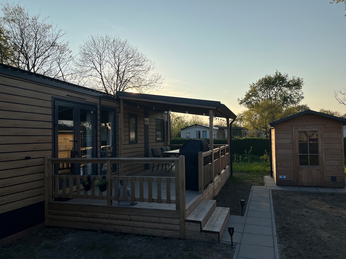 LUXE TRENDY VAKANTIE CHALET 45M2, geschikt voor 4 personen. Stijlvolle high end ingerichte chalet , deels overdekte veranda , ruime tuin met veel privacy en gratis privé parking naast chalet! Ultiem genieten en voorzien van alle luxe en gemakken; -airco -cv -ruime moderne complete open keuken voorzien van zout, peper, suiker, thee, koffie kruiden etc. -vaatwasser -oven -gasfornuis -grote koelkast met vriezer -fijne douche -aparte toilet -2 slaapkamers -2 ruime kasten -muggenhorren