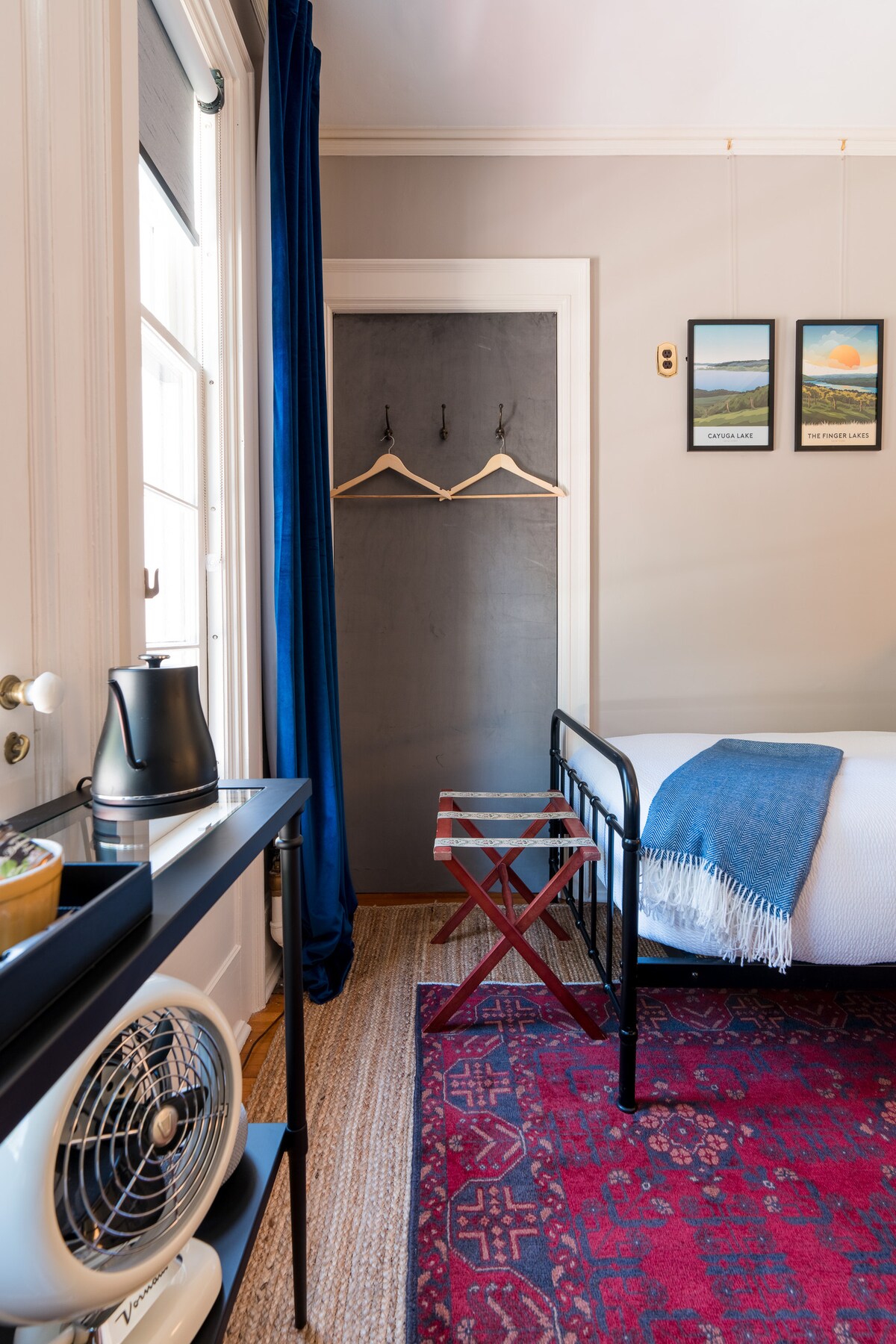 Bespoke Queen, muhteşem bir kızak yatağı, gazlı şömine ve jetli küvetli spa esintili banyosu ile zarif bir konfor sunar. Özenle seçilmiş mobilyalar, oda içi kahve servisi, mini buzdolabı, pelüş bornozlar ve lüks demirbaşlarla modern konforla buluşuyor. Tarihi konağın oturma odasının, kütüphanesinin, güneşlenme odasının, bahçelerinin ve verandanın keyfini çıkarın. Şarap Yolu, Cayuga Gölü ve Taughannock Şelalesi'nden anlar - mükemmel Finger Gölleri inzivası.