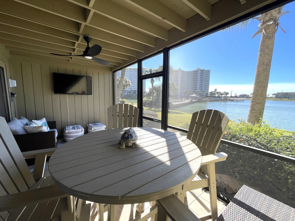 -Lakefront with great views of Lake Stewart on the 14th hole off our double screened in patio. We are steps away from white sand beaches of the Gulf of Mexico. -Two Primary en-suites bedrooms, each with a king-size bed. Shopping, coffee bar & restaurants/bars within walking distance. Explore on foot or rent a golf cart/scooter at a near by vendor. This is a ground floor condo with drive up parking. All the comforts of home in our golf villa located in beautiful Seascape Golf & Tennis Resort.