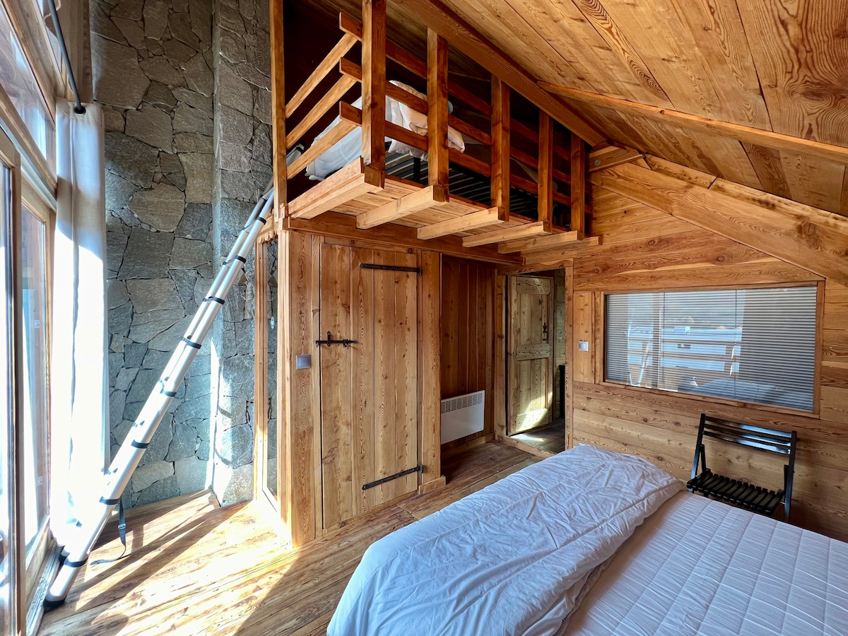 Dağ evi, her yönden zirvelere panoramik bir manzara sunuyor. Cumbalı pencereleri manzarayı yaşamak izlenimi veren oturma odasının yanı sıra katta, hepsi de manzara noktalarını çoğaltmak için geniş açıklıklara sahip 3 yatak odası (2 kapalı) ve bir banyo bulunmaktadır. Özgünlük ve çağdaşlığın bir karışımı olan iç tasarım, doğal bırakılan baskın ahşapla uyumlu olarak kır evi stilini benimsiyor. Renk ve malzeme seçimi, sizi kucaklayan bir atmosfer sağlar.