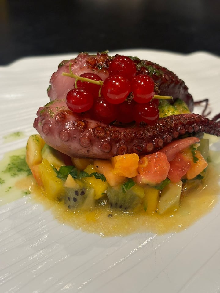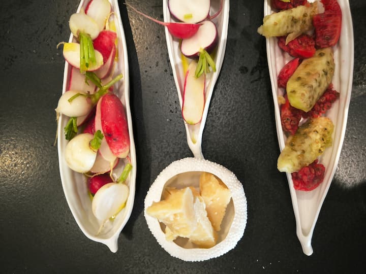 Amuse-bouche; İtalyan usulü siyah trüflü carpaccio; Beyaz çikolata ve gül risotto; İncir ve mevsim sebzeleriyle Fassona dana fileto; Peynir seçkisi; Üçlü çikolatalı semifreddo