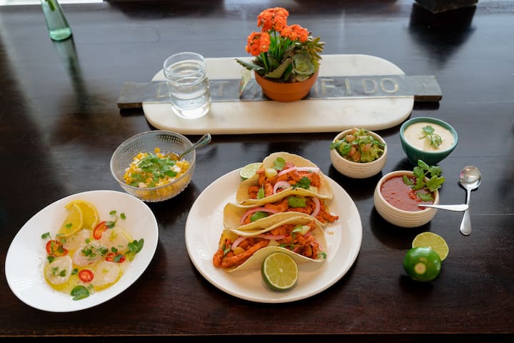 Tavuk tinga, marullu un tortilla, jalapenos turşusu, krema