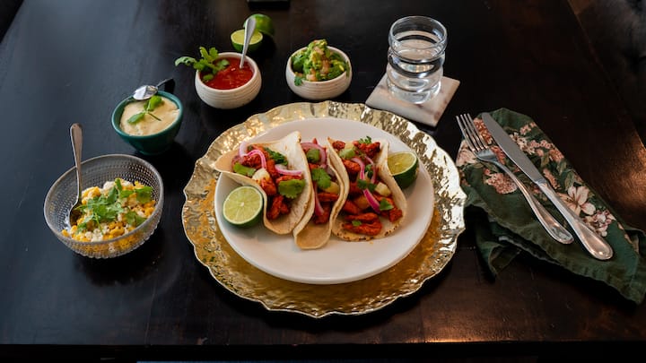 Al pastor, turşulu soğanlı mısır tortilla, queso fresco, kişniş