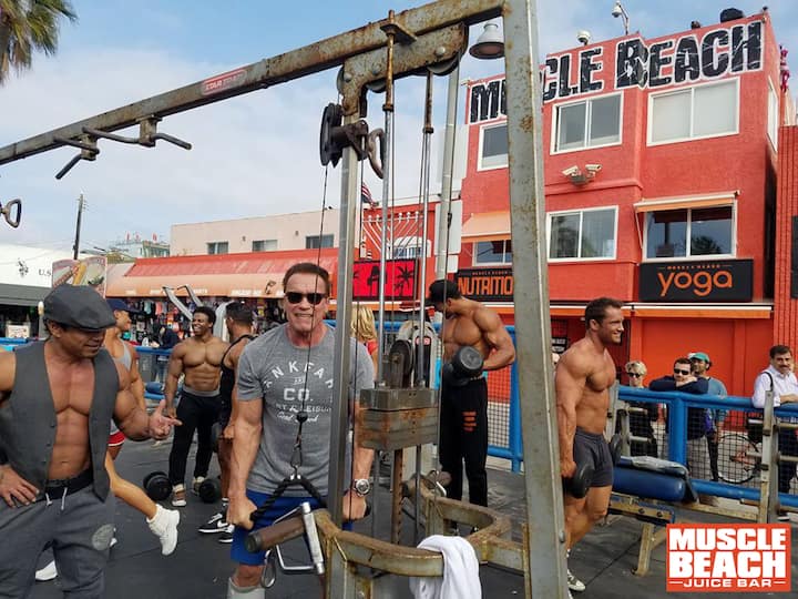 Arnold Schwarzenegger'in antrenman yaptığı ünlü mekânda bir vücut geliştirme veya fitness antrenmanı seansı.