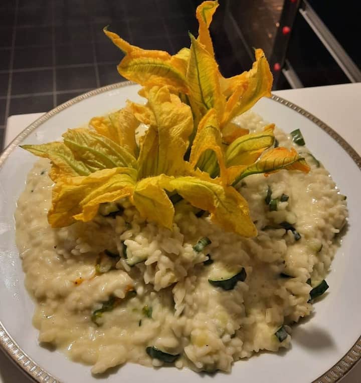 En iyi mevsimlik İtalyan malzemeleri, kuşkonmazlı pilav, keçi peyniri ve kabak çiçeği ve diğer mevsimlik lezzetlerle hazırlanmış özel bir menü.