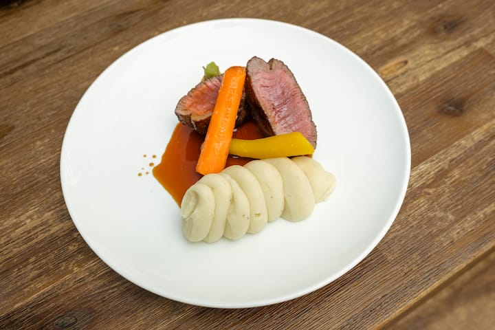 Modern teknikler ve sunum kullanılarak hazırlanan organik malzemeler ve otla beslenen hayvanlardan elde edilen ürünlerle akşam yemeği.