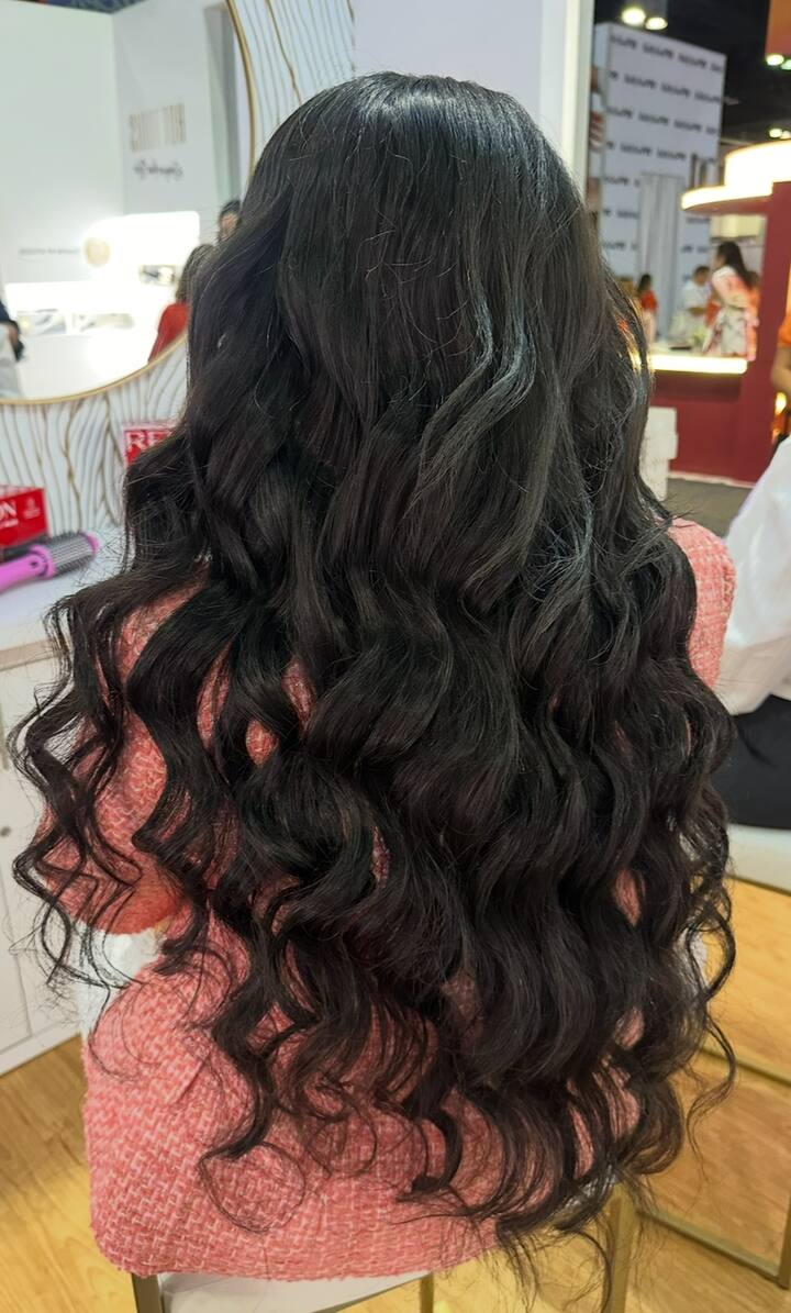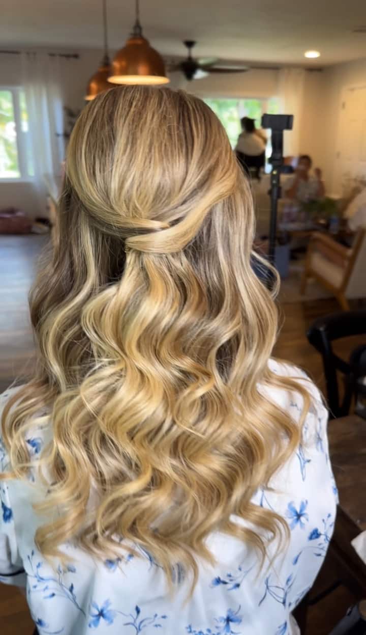 Bu oturum, ferah ve zarif bir görünüm için klipsli postişlerle kuru saç şekillendirme içerir.