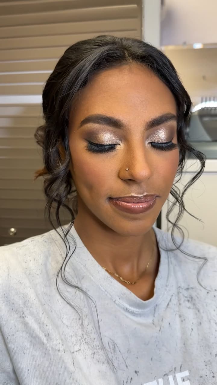 Bu makyaj seansı, doğal ve parlak bir görünüm için kirpik, dudak ve pudra uygulaması içerir.
