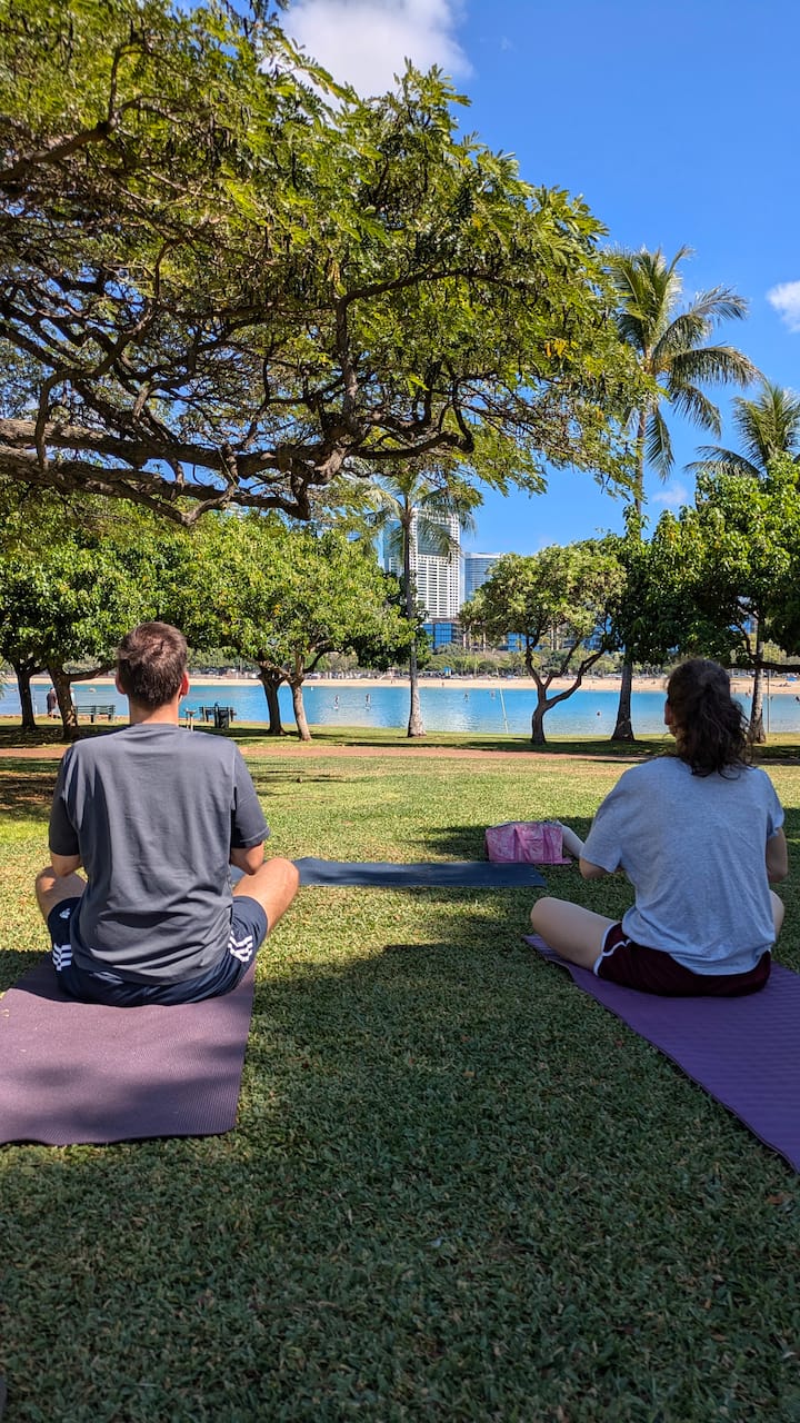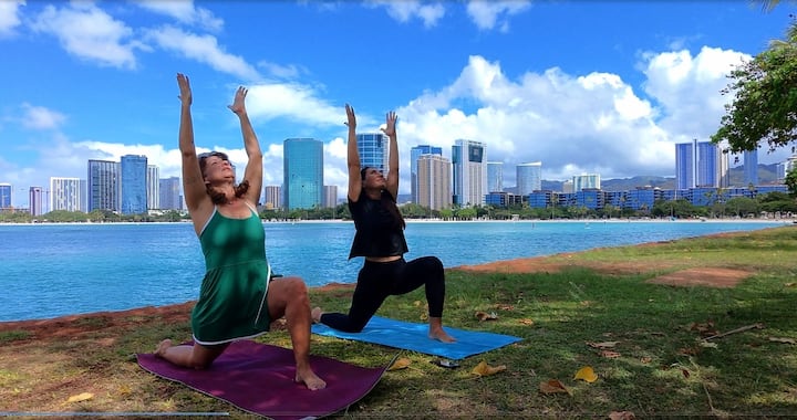 Pazar gününe dinginlik ve güneş ışığıyla başlayın! Palmiye ağaçları, okyanus esintisi ve nefes kesen Diamond Head manzarasıyla çevrili Magic Island'daki küçük grup yoga dersimize katılın.
