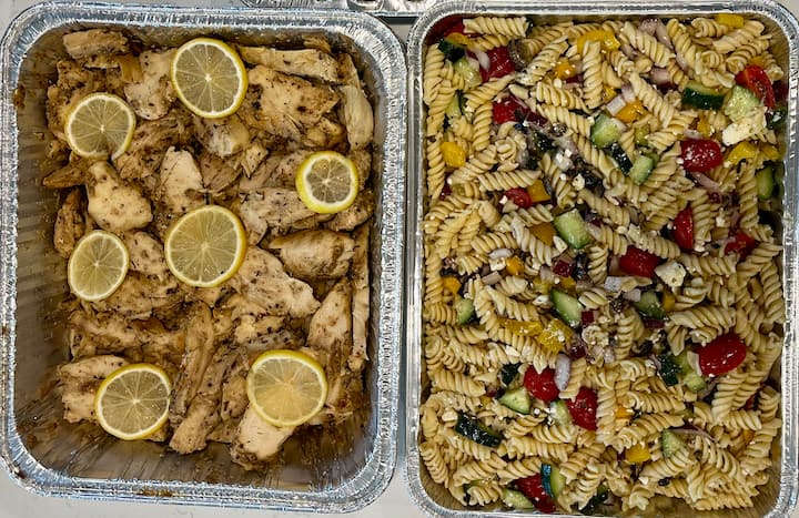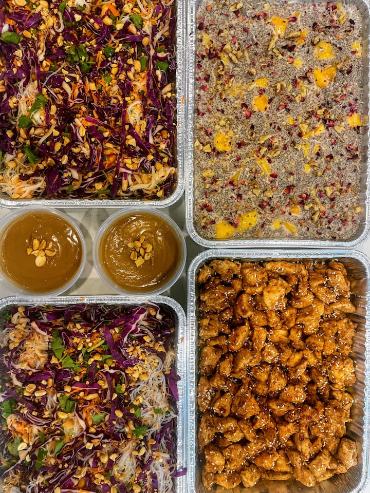 Tay erişte salatası, tatlı acı biberli tavuk ve mango hindistan cevizli chia pudingi içeren lezzetli, cesur ve glutensiz bir yemeğin tadını çıkarın. Bu yemek, uygun yemek hazırlıkları için ayrı ayrı paketlenebilir veya aile tarzında servis edilmek üzere teslim edilebilir.