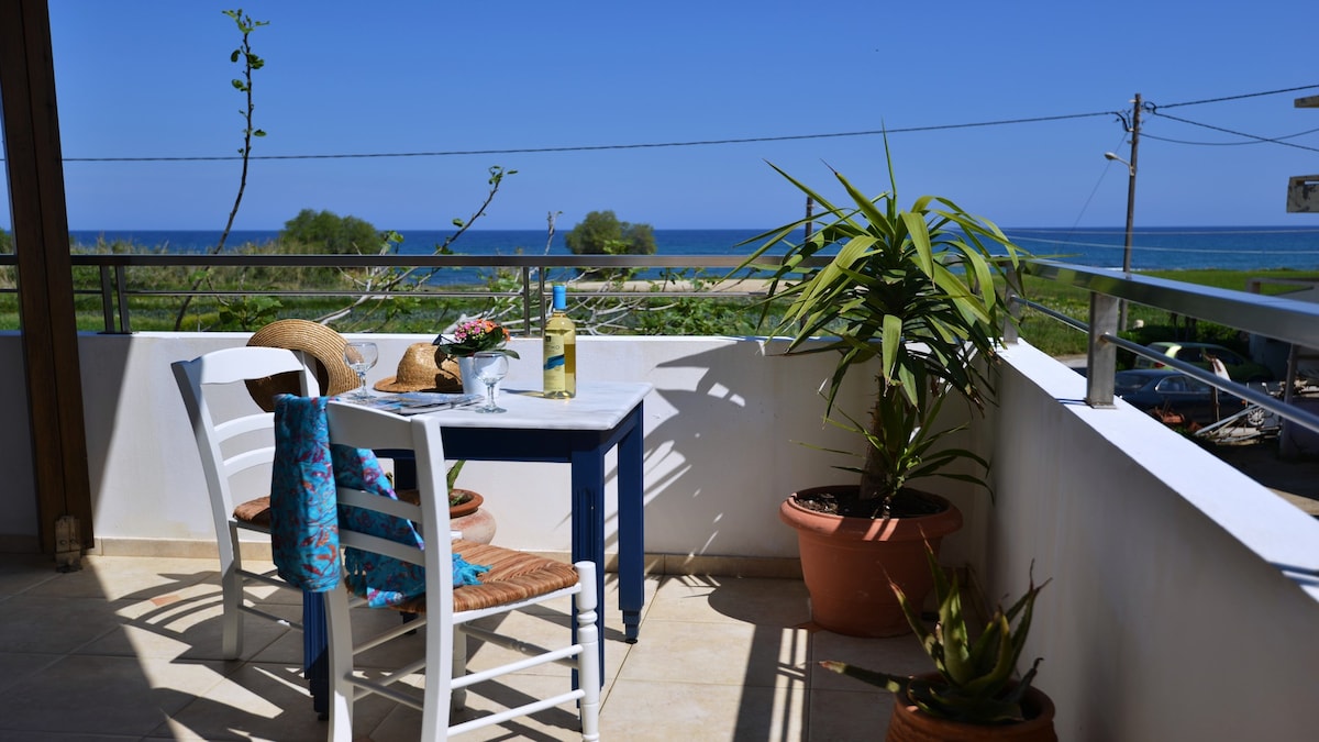 Harmony'de konaklayın - Oda# IV Çiftler veya yalnız seyahat edenler için ideal olan konforlu ve şık bir konaklamanın keyfini çıkarın. Rahat bir king boy yatak ve canlı sokaklara bakan özel balkon ile 2 misafir barındırır. Plaja, mağazalara, kafelere ve restoranlara yakın ve sadece kısa bir yürüyüş mesafesinde. Plaj ve otoyol Dairelerin hemen altında bir tarımsal malzeme mağazası bulunmaktadır ve yakındaki otoyol Girit'e kolay erişim sağlar. Konaklamanız sırasında kamyonlardan veya trafikten bazı gürültülerin gelebileceğini lütfen unutmayın.