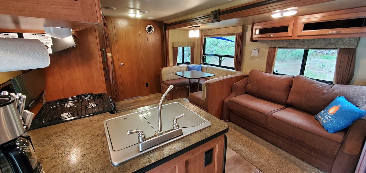 Bu lüks karavan, Lassen Volkanik Ulusal Parkı'na yakın Living Springs Resort'ta görkemli çam ağaçları bulunan ormanda bulunmaktadır. Kamp yapmak gibi, ancak rahat yataklarınız, küçük mutfağınız, özel banyonuz, elektriğiniz, klimanız, ısıtmanız vb. var. En iyi şekilde lüks kamp! Küçük bir gölümüz, diğer adıyla balıkçı göletimiz ve deremiz de var.