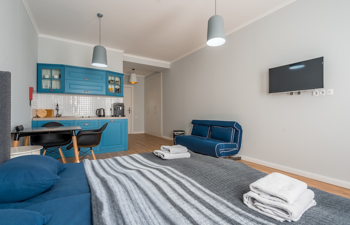 Rahat Stüdyomuz Bakuriani'de, merkezde bulunmaktadır. Her şey yakındadır: sinema, mağazalar, park, otobüs durağı, telesiyejler. Mekânda 4 misafir, bir tam boy yatak ve iki kişilik bir çekyat bulunmaktadır. Stüdyo ihtiyacınız olan her şeyle donatılmıştır. Bina şehrin göbeğinde bulunmaktadır, her şey iki adım uzaklıktadır: sinema, mağazalar, otobüs durağı, park. Yeni binadaki otel kompleksinde rahat bir daire. Her iki odada da modern TV'ler. Kablo TV ve kablosuz internet bağlantısı. Mutfakta gerekli her şey var.