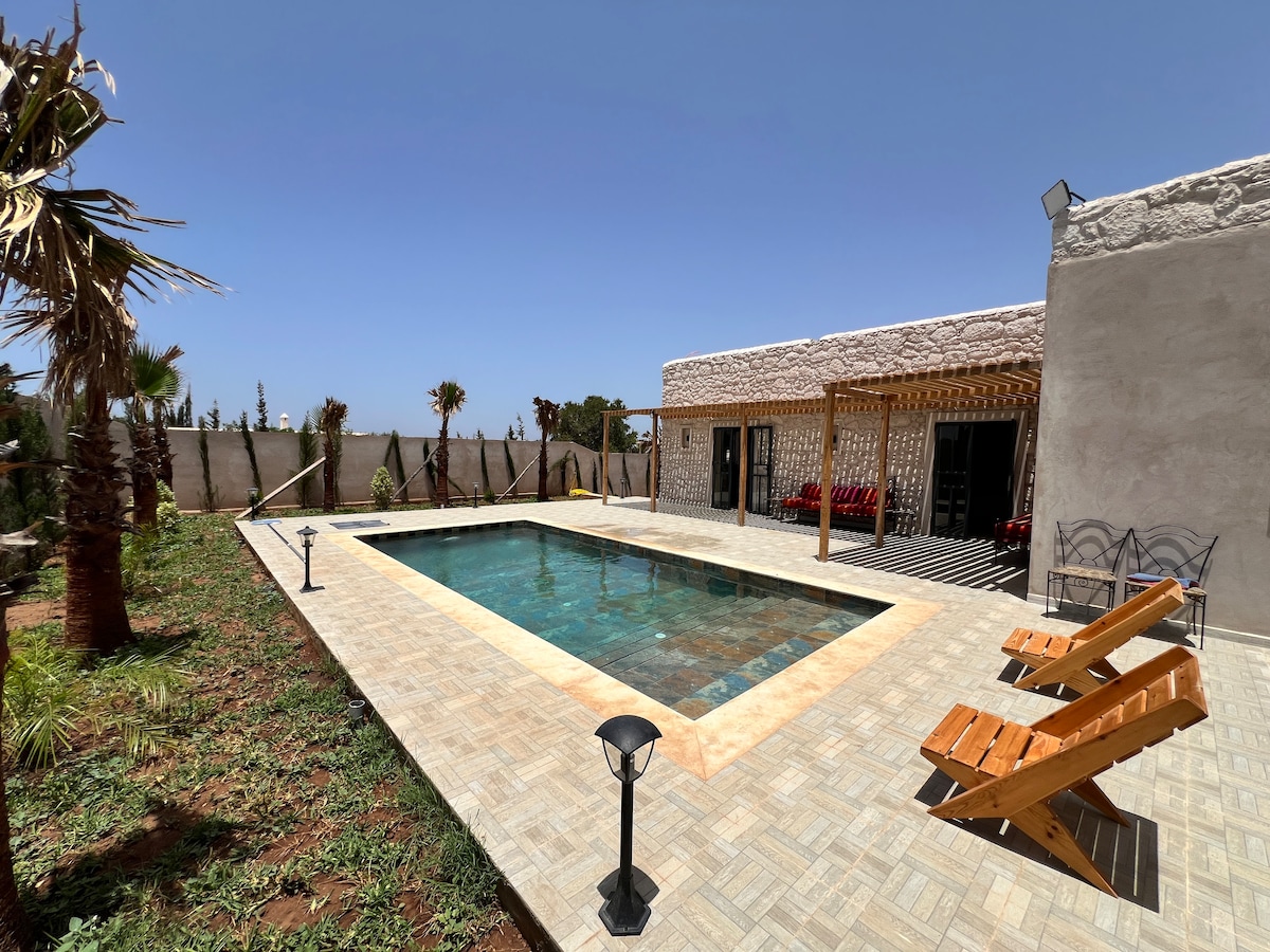 Kesme taştan yapılmış özel bungalov, sessiz ve huzurlu, 15 dakika içinde Essaouira'ya, havaalanına 7 dakika ve Sidikaoui Plajı'na 10 dakika. Gelin ve özel havuzda dinlenin ve gözden uzak bir argan ağacının gölgesinde dinlenin. Oturma odasına açılan donanımlı mutfak, bir yatak odası ve iki banyosu olan ev.