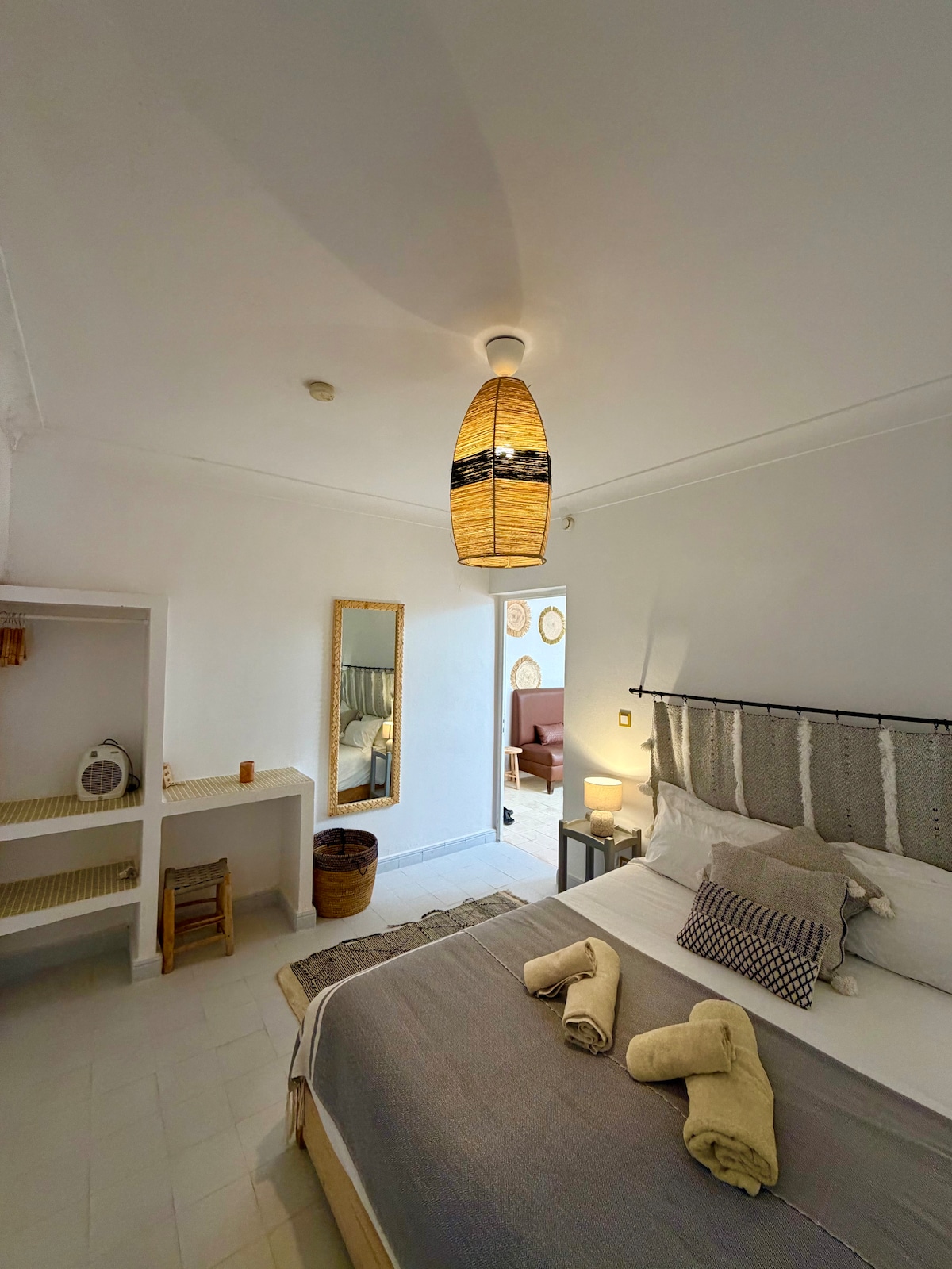 Mama Lova 1 süiti, geleneksel zarafeti modern konforlarla birleştirerek Essaouira'nın kalbinde benzersiz bir deneyim sunuyor. Saray yatakları ve şilte altlıkları olan iki geniş yatak odası ile donatılmış bu, olağanüstü bir uykuyu garanti eder. Asil yerel malzemelerle dekore edilmiş bu süit, uyumlu ve samimi bir alan sunuyor. Unutulmaz bir konaklama için doğal banyo ürünlerinin ve terasta servis edilen gurme kahvaltının keyfini çıkarın.