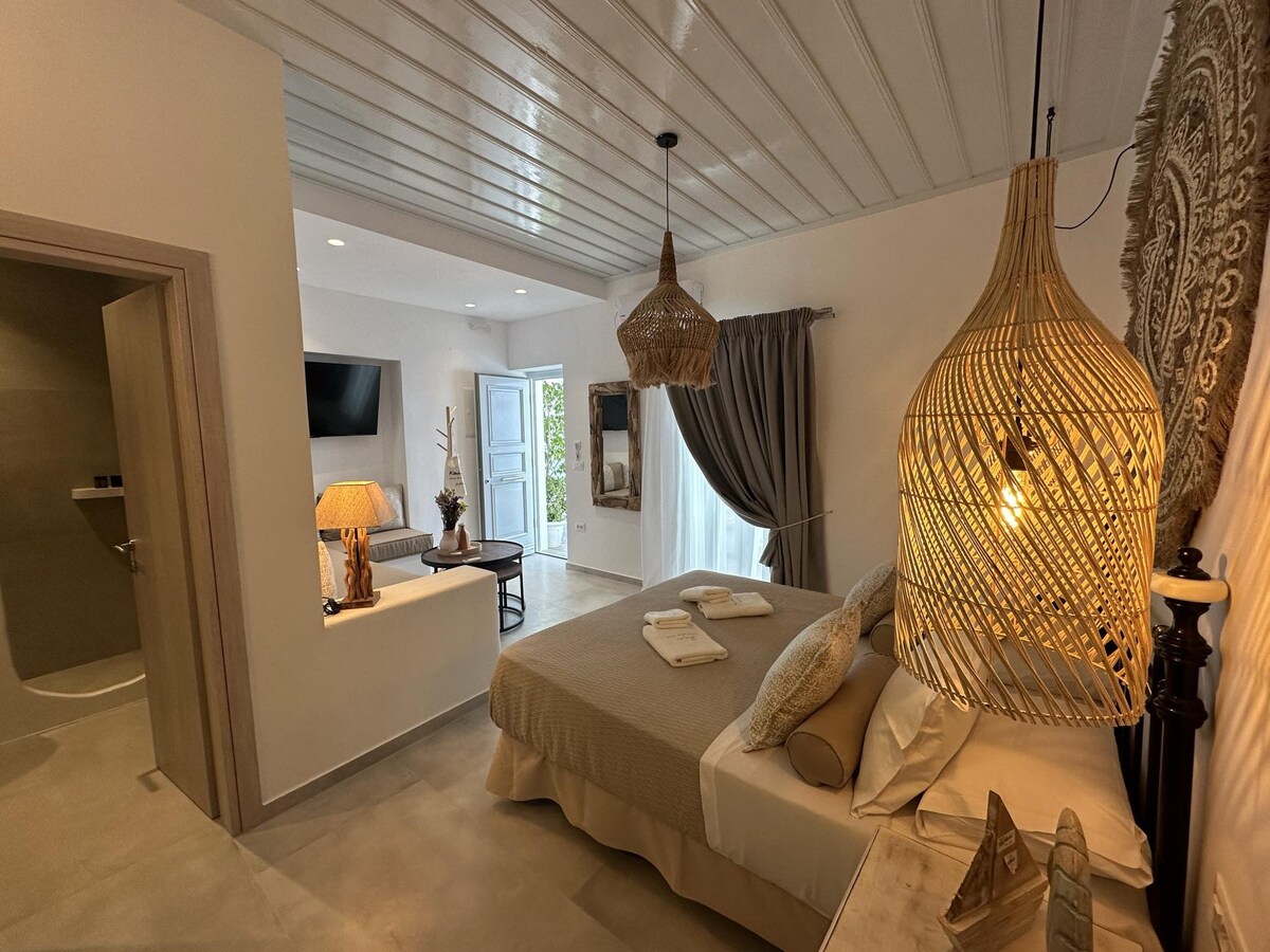 Dalgaların hemen yanına inşa edilen Beachfront Süitimiz, Ege'nin sonsuz mavisinin nefes kesici manzarasını ve sizi büyüleyecek bir huzur duygusu sunuyor. Güne denizin yatıştırıcı sesiyle başlayın ve ünlü Platis Gialos Plajı'na sadece birkaç adım uzaklıktaki özel terasınızda güneşin tadını çıkarın. Toprak tonlarında dekore edilmiş alan, sıcaklık ve zarafet yayıyor, geniş çift kişilik yatak ise dinlenme ve esenlik anları için üstün konfor sağlıyor!