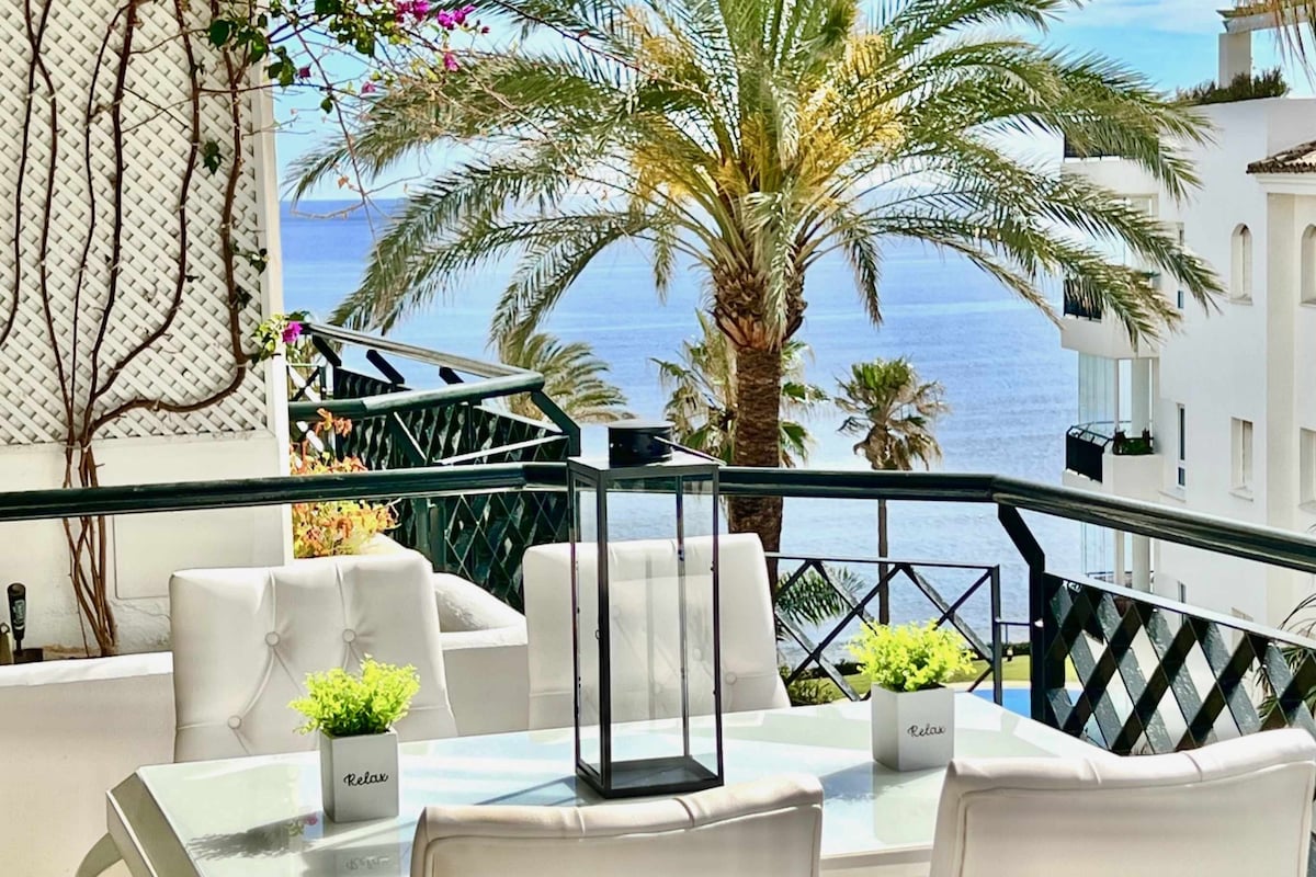 Cozy, bright, entirely renovated quality flat on the front line with sea views from the sunny and large balcony, both rooms and the bathroom. Features his and her shower, full kitchen, 2 tennis courts, 2 swimming pools (1 for children) large gardens, private beach area, free beach beds and private parking. We have a sandy beach with Blue Flag status and direct access to the sea boardwalk. Near Marbella and La Cala with 75+ restaurants and many shops walking distance. Strict cleaning.