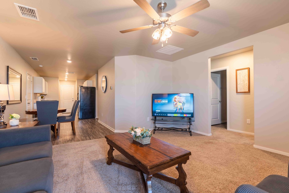 Lubbock'un en iyi semti olan LakeRidge Country Club'da bulunan bu şık 2 yatak odalı 2 banyolu evin konforuna adım atın. 82. Cadde ve Quaker yakınında, Lubbock'un en iyi restoranları ve alışveriş merkezleriyle çevrili, Texas Tech ve tıp bölgesine 10 dakika mesafede. MidMod tasarımı ve zengin olanak listesi her türlü ihtiyacınızı karşılayacaktır. ✓ 2 konforlu yatak odası ✓ Açık Konsept Yaşam ✓ Tam donanımlı mutfak ✓ Bar tezgahı çalışma alanı ✓ Garaj park yeri ✓ Arka bahçe (barbekü, cornhole, mini golf) ✓ Yüksek hızlı kablosuz internet bağlantısı. ✓ Akıllı TV'ler