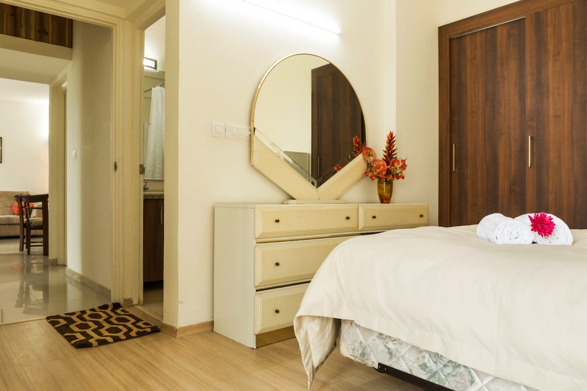 Hem konfor hem de kolaylık arayan aileler veya iş için seyahat eden gruplar için mükemmel bir yer. 15 günden uzun aylık/uzun süreli konaklamalar için📍 ekstra indirimler📍 Tek başına seyahat eden kızlar için güvenli. Huzurlu ama canlı bir semtte bulunan güzel döşenmiş 3 yatak odalı dairemizde şık bir şekilde dinlenin. Film gecesi için ev projektörü, Netflix ve dinlenme, bilardo/TT masası/badminton gibi birinci sınıf olanaklara erişim. Topluluk içinde Japon ve Hint restoranları