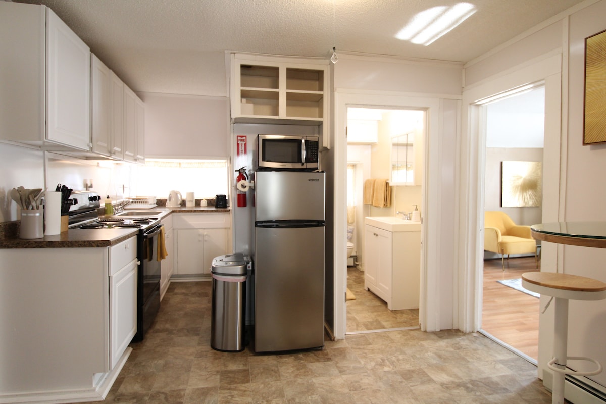 Bu sakin, şık yerde arkanıza yaslanın ve rahatlayın. İkinci kattaki bu dairede yeni yenilenmiş bir banyo, tam donanımlı bir mutfak, iki kişi için mükemmel olan konforlu bir yatak odası ve ikiz yatağa dönüşen sandalyelerle rahat bir oturma alanı bulunmaktadır. Ayrıca bir araç için sokak dışı park yeri ve verandada özel bir giriş sunmaktadır. Rahatlamak ve yazın ve sonbaharın tadını çıkarmak için mükemmel bir yer. Sizi karşılayacak (ancak rahatsız etmeyecek) kedimiz Taffy ile birlikte sizi evimizin tadını çıkarmaya davet ediyoruz.