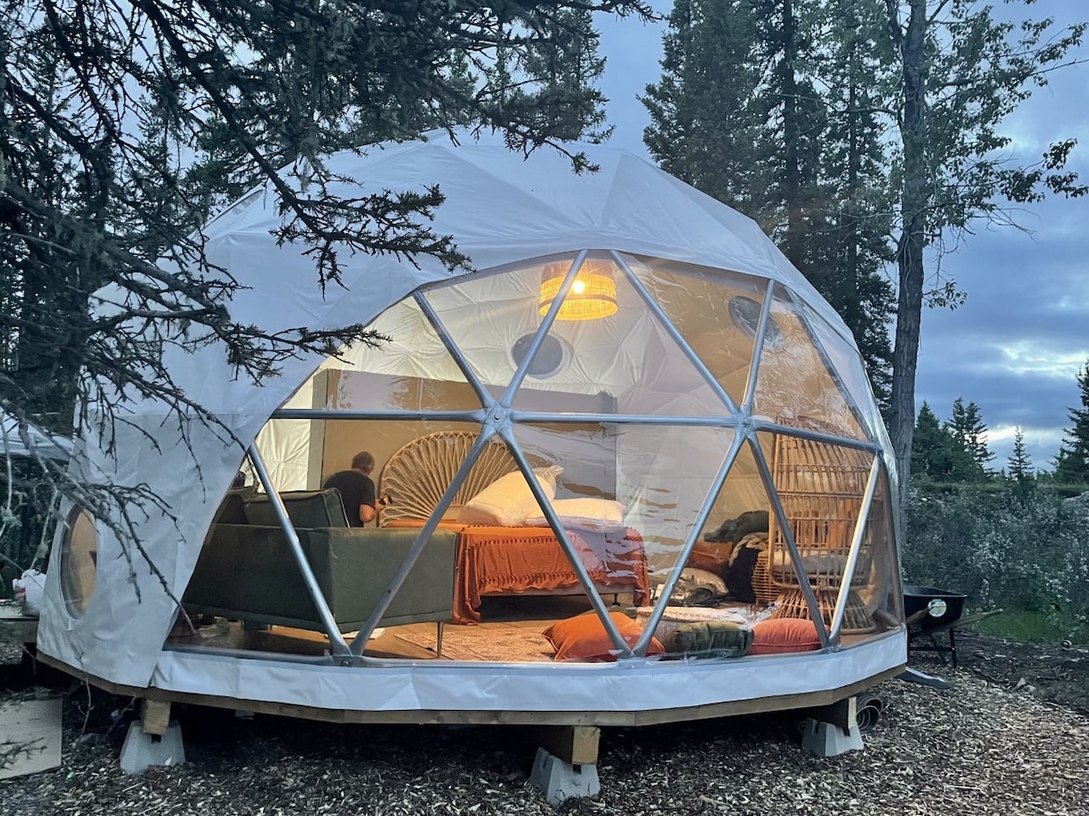 Benzersiz Grizzly Nook Dome'umuzdan Rockies'in nefes kesen panoramik manzarasına uyanın ve rahat ve samimi bir inzivanın tadını çıkarın! Kubbemizde 1 queen boy yatak, yemek ve oturma alanları, ateş çukuru (ve çakmak) ve dışarıda bir alan bulunmaktadır. Ayrıca bir su sürahisi, bardak ve su ısıtıcısı da sunuyoruz. Misafir, farklı bir binada tuvalet ve musluklu ortak bir banyoya erişebilecektir. Şu anda duş almak yasaktır. Kubbe ısıtılmaz, ancak gerekirse bir vantilatör sağlıyoruz.