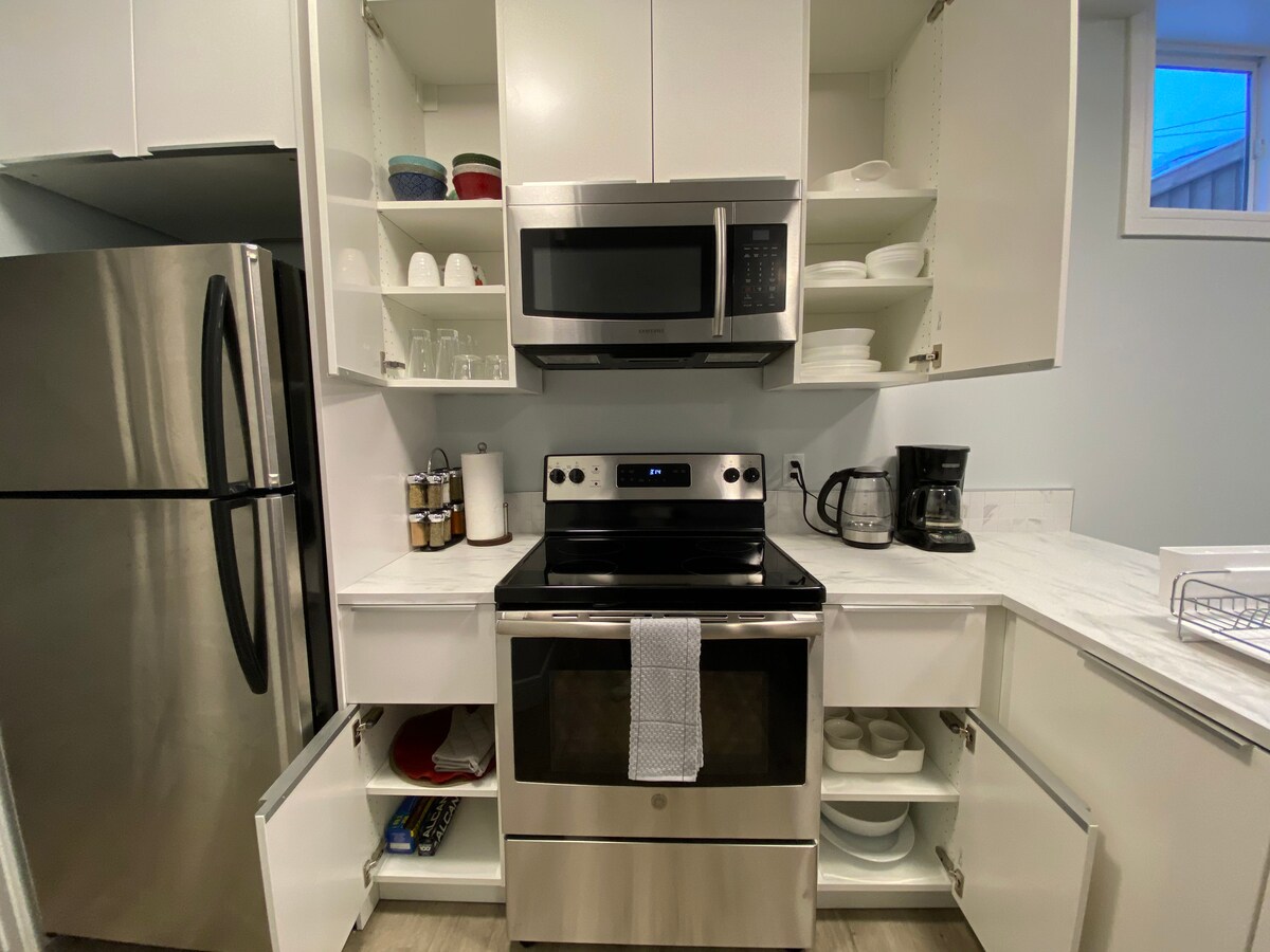 🏡 Temel Özellikler ✔️ Aydınlık, tertemiz yasal bodrum süiti Queen boy yataklı ve otel tarzı nevresim takımlı✔️ 2 yatak odası ✔️ Yalnızca 5. misafir için Japon tarzı futon – talep üzerine ekstra kullanım ✔️ Sütlü Keurig kahve makinesi bulunan mutfak 58 inç ✔️akıllı TV ile✔️ rahat oturma odası Şık iç mekan asma koltuğu ✔️ Özel giriş ve kolay kendi kendine giriş Sokakta veya garaj yolunda✔️ ücretsiz park yeri 📍 Yakındaki yerler Alışveriş merkezine arabayla✔️ 2 dakika. ✔️ Rabbit Hill Kayak Merkezi'ne arabayla 15 dakika. YEG'ye arabayla✔️ 20 dakika WEM'e arabayla✔️ 20 dakika.